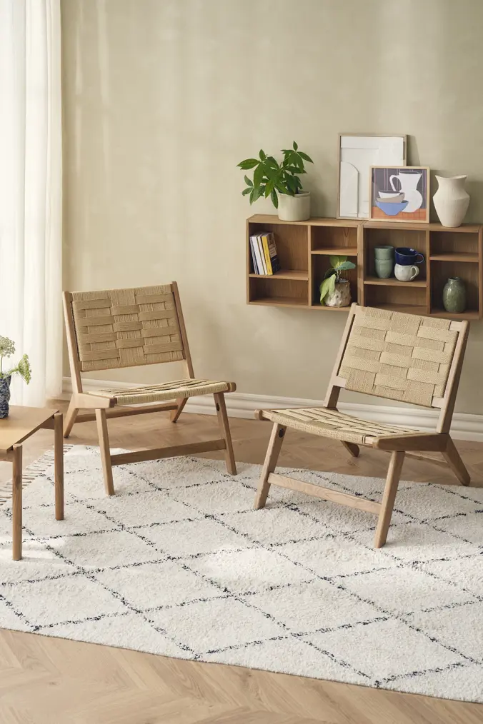 - A lounge chair in solid oak with a woven seat, designed for comfort and relaxation. With its harmonious silhouette and tactile woven seat, the chair pays tribute to traditional craftsmanship and Danish design heritage.