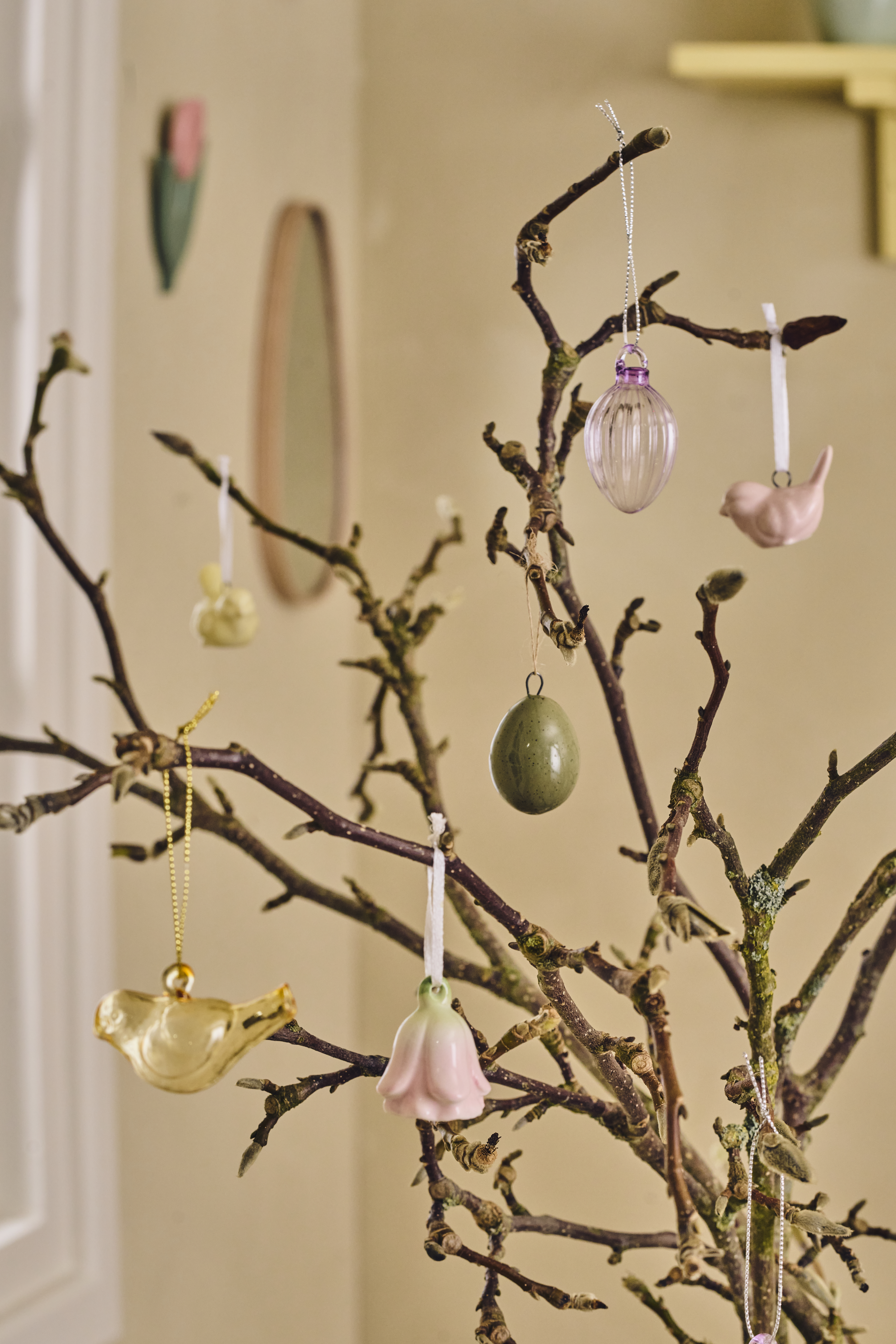 Invite spring branches indoors and decorate upwards with various hanging ornaments to suit your style. One of this year’s biggest trends is pairing classic Easter eggs – in all kinds of materials, colours and shapes – with whimsical little figures such as bellflowers and birds. Mix various ornaments for a light, playful and personal arrangement.